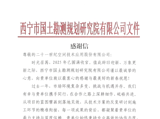 近日,西宁市国土勘测规划研究院有限公司向世纪空间发来感谢信,对世纪空间在过去一年的合作中,为重...