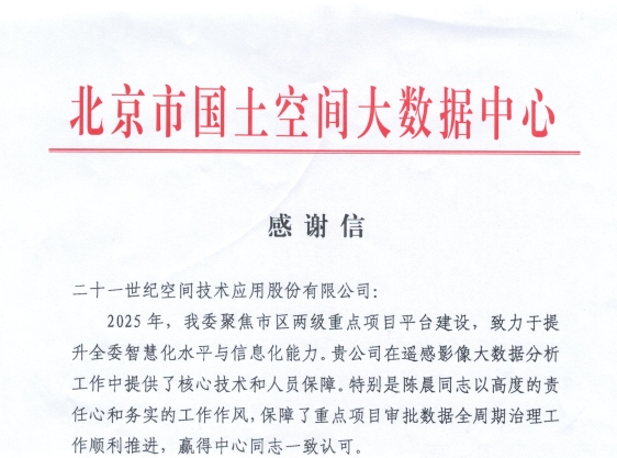 近日,北京市国土空间大数据中心向世纪空间发来感谢信,对世纪空间在遥感影像大数据分析工作中所提供...