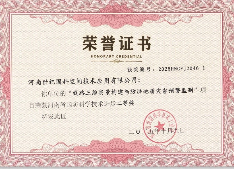 近日,河南省国防科学技术工业办公室发布2025年度省国防科学技术进步奖获奖名单,公司与河南世纪国科、中科大数据研究院共同申报研发的“线路三维实景构建与防洪地质灾害预警监测”项目荣获二等奖。
