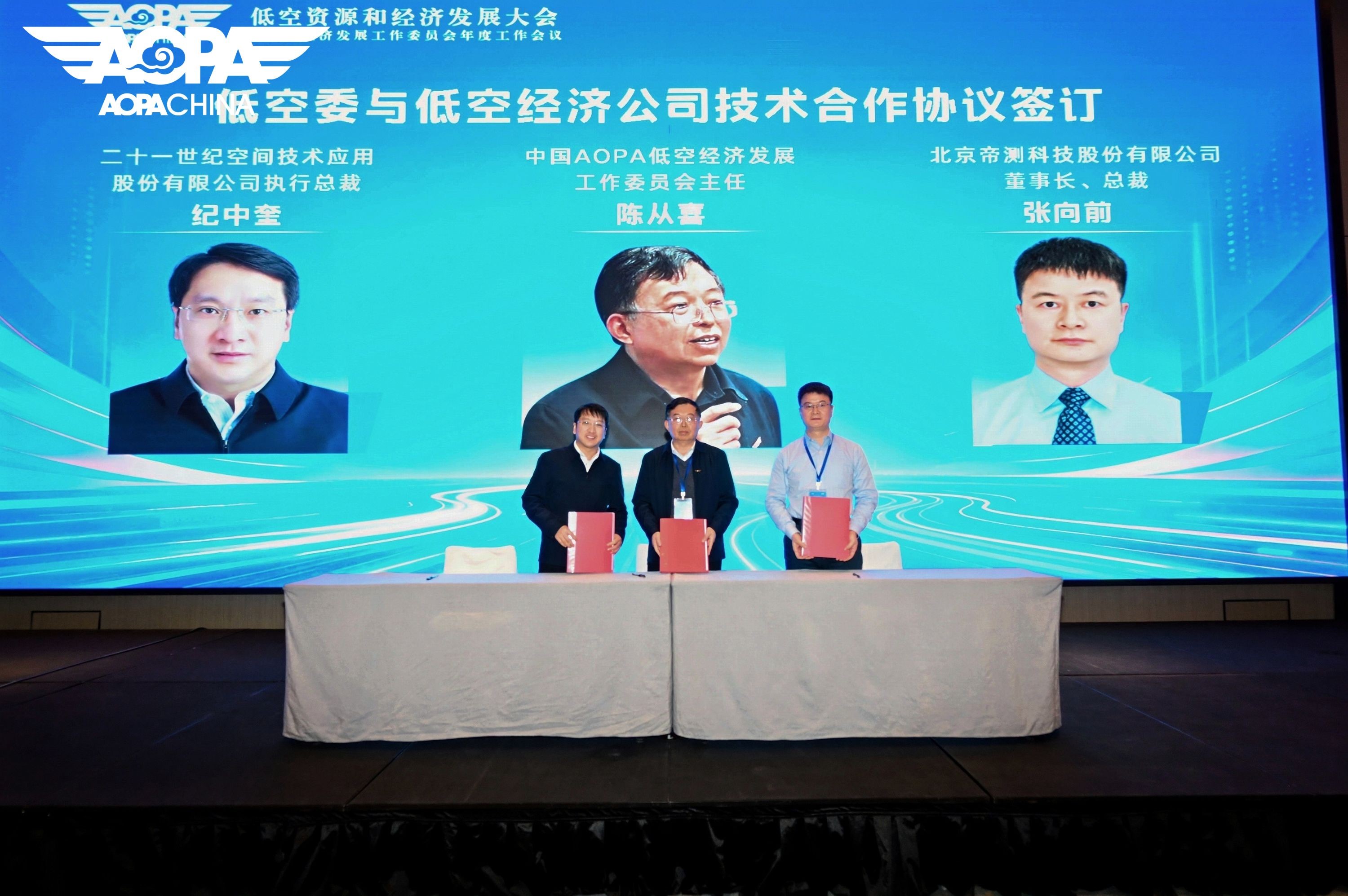 在大会签约环节,世纪空间执行总裁纪中奎代表公司,与中国AOPA低空经济发展工作委员会、北京帝测科技公司签署了战略合作协议。
